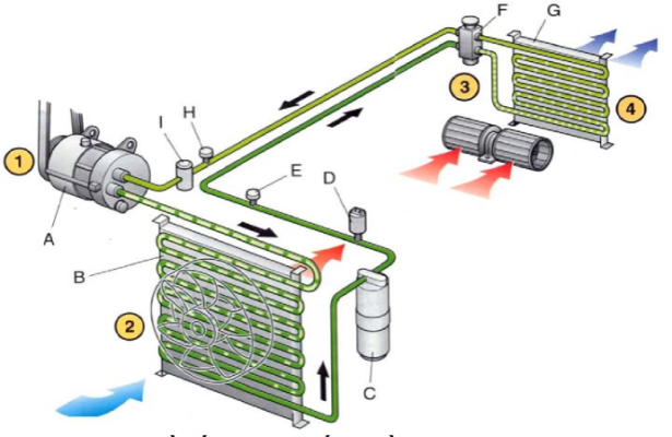 - Tản nhiệt và làm lạnh. Tại giàn nóng, chất lỏng được tản nhiệt và chuyển sang giai đoạn bay hơi, hút nhiệt từ môi trường xung quanh, và sau đó được thổi qua giàn lạnh vào cabin.